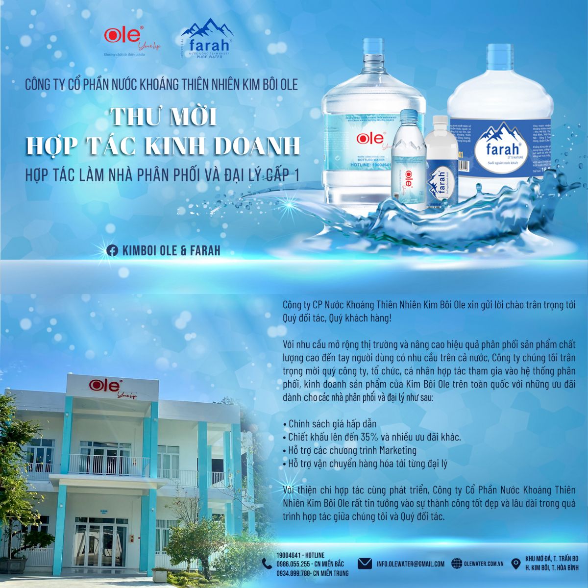 Công ty cổ phần nước khoáng thiên nhiên Kim Bôi Ole Tuyển nhà phân phối và đại lý trên toàn quốc Chúng tôi là nhà sản xuất nước khoáng thiên nhiên thương hiệu Ole, nước tinh khiết thương hiệu Farah, nước ion kiềm Epione lớn nhất Việt Nam . Nhà máy sản xuất tại mỏ…